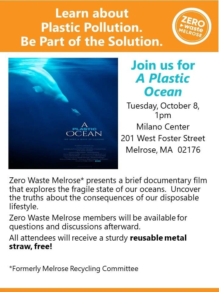 Join Us for A Plastic Ocean — October 8 at The Milano Center Tuesday, October 8, 2019 1:00 PM 3:00 PM The Milano Center 201 West Foster Street Melrose, MA, 02176 United States (map) Google Calendar ICS Zero Waste Melrose Presents a brief documentary film that explores the fragile state of our oceans. Uncover the truths about the consequences of our disposable lifestyle.